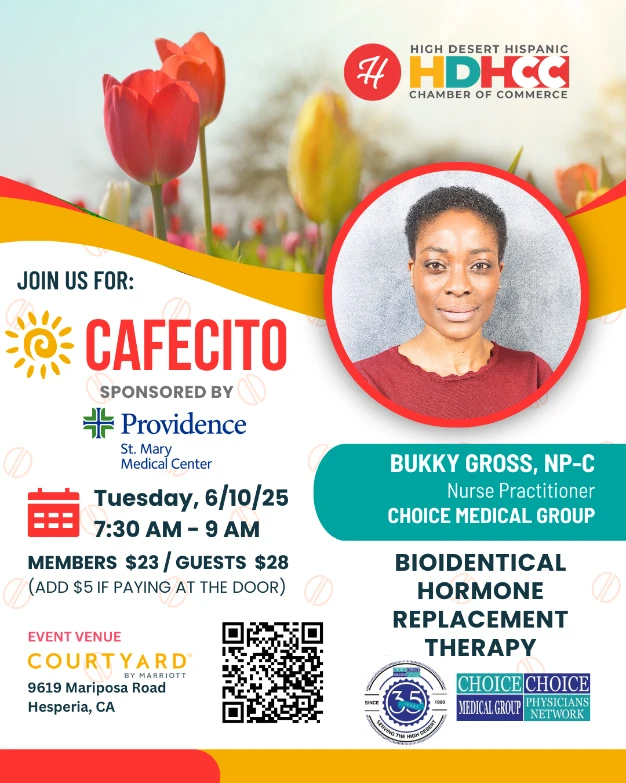 Courtyard by Marriott, Hesperia 9619 Mariposa Road, Hesperia, CA, United StatesEngage with fellow business professionals in a networking event that offers a blend of business resources, member presentations, and the warmth of Cafecito, Pan Dulce, and Breakfast. This gathering provides a unique opportunity to connect, share insights, and build valuable connections in a welcoming and nourishing environment. This month's speaker is Bukky Gross, NP-C of […]